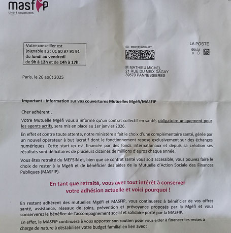 D’habitude, je n’y prête guère attention : Ma mutuelle a connu bien des évolutions et elle est passée de nos réunions annuelles, conviviales, où nous débattions et décidions encore âprement avant boire, à des liens plus distants, plus administratifs et désormais informatisés … de la « Mutuelle des Agents de l’Enregistrement » à l’actuelle, les choses avaient bien changé … mais il restait encore un peu des principes anciens : un correspondant, un accompagnement et qui sait, peut-être encore quelqu’un d’attentif au bout de la ligne… Je m’en étais passé jusque-là, alors, pourquoi lire cette lettre, plutôt que les autres…